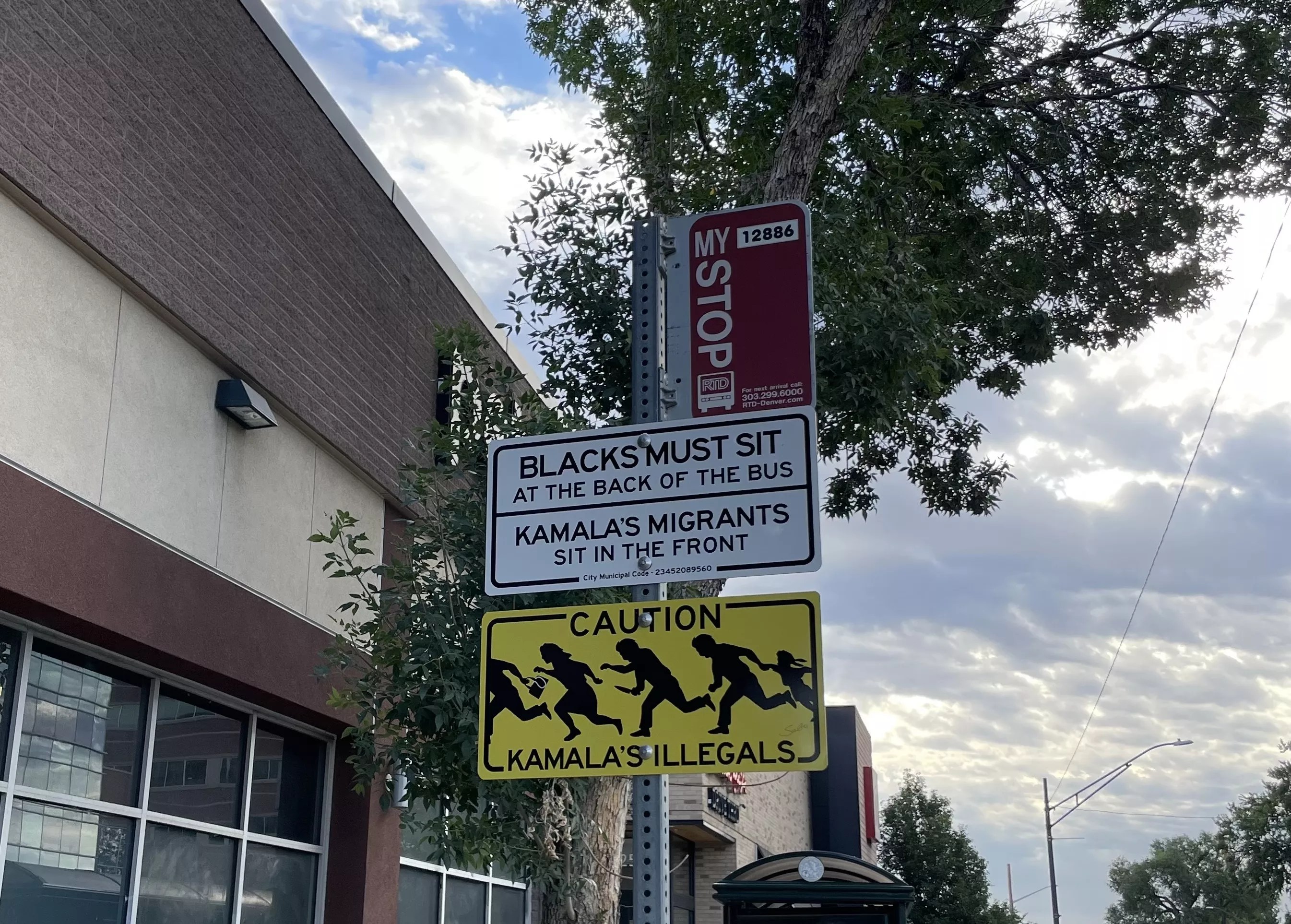 The signs include wording such as “Blacks must sit on the back of the bus. Kamala’s migrants sit in front,” referencing Vice President Kamala Harris, the 2024 Democratic presidential nominee whose husband is visiting Colorado today.