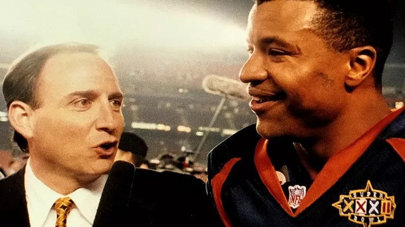 Les Shapiro interviewing Denver Broncos legend Steve Atwater at Super Bowl XXXII.