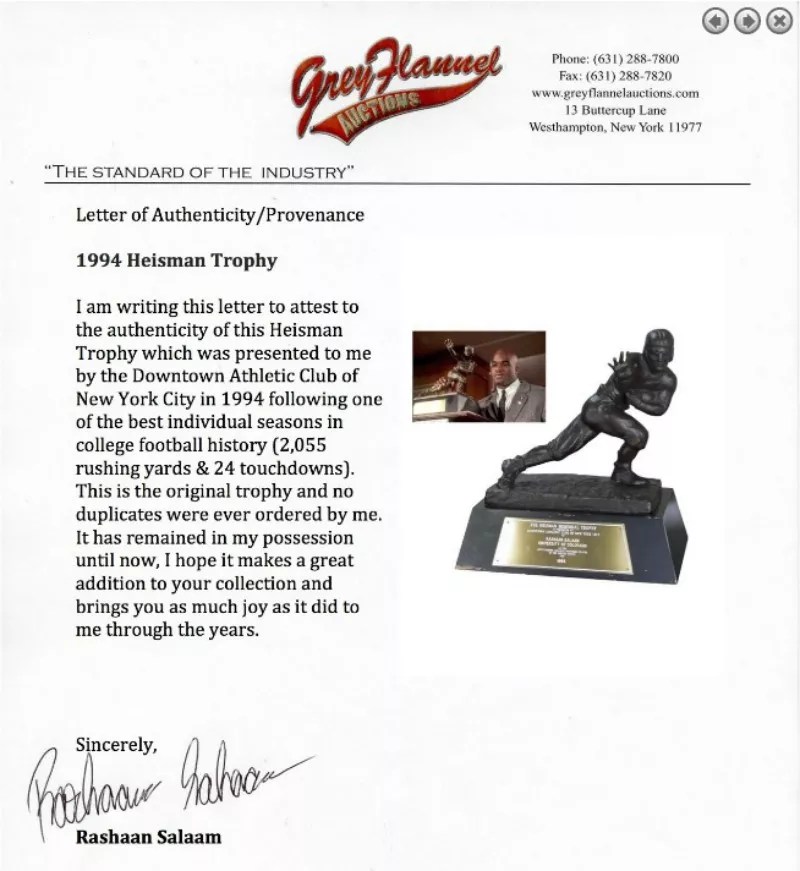Salaam acknowledged the trophy’s sale in a letter that appears on the site and attests to its authenticity: