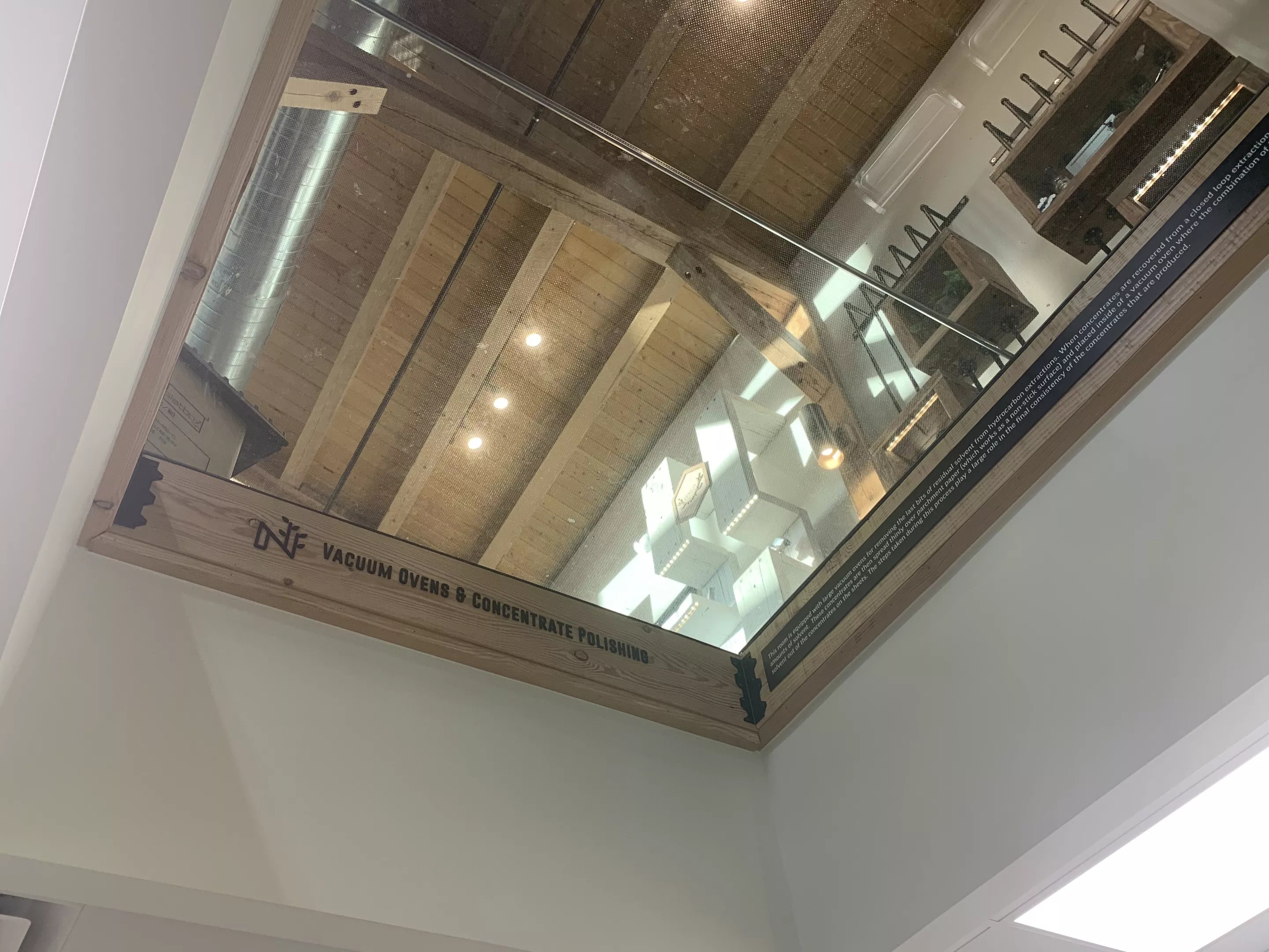 A 3,500-square-foot retail area occupies the building’s second floor, with a marijuana processing facility complete with an industrial kitchen and a butane extractor on the first floor. Sections of glass flooring allow visitors to watch edibles and concentrate production in the facility below, with signs explaining each step of the manufacturing process.