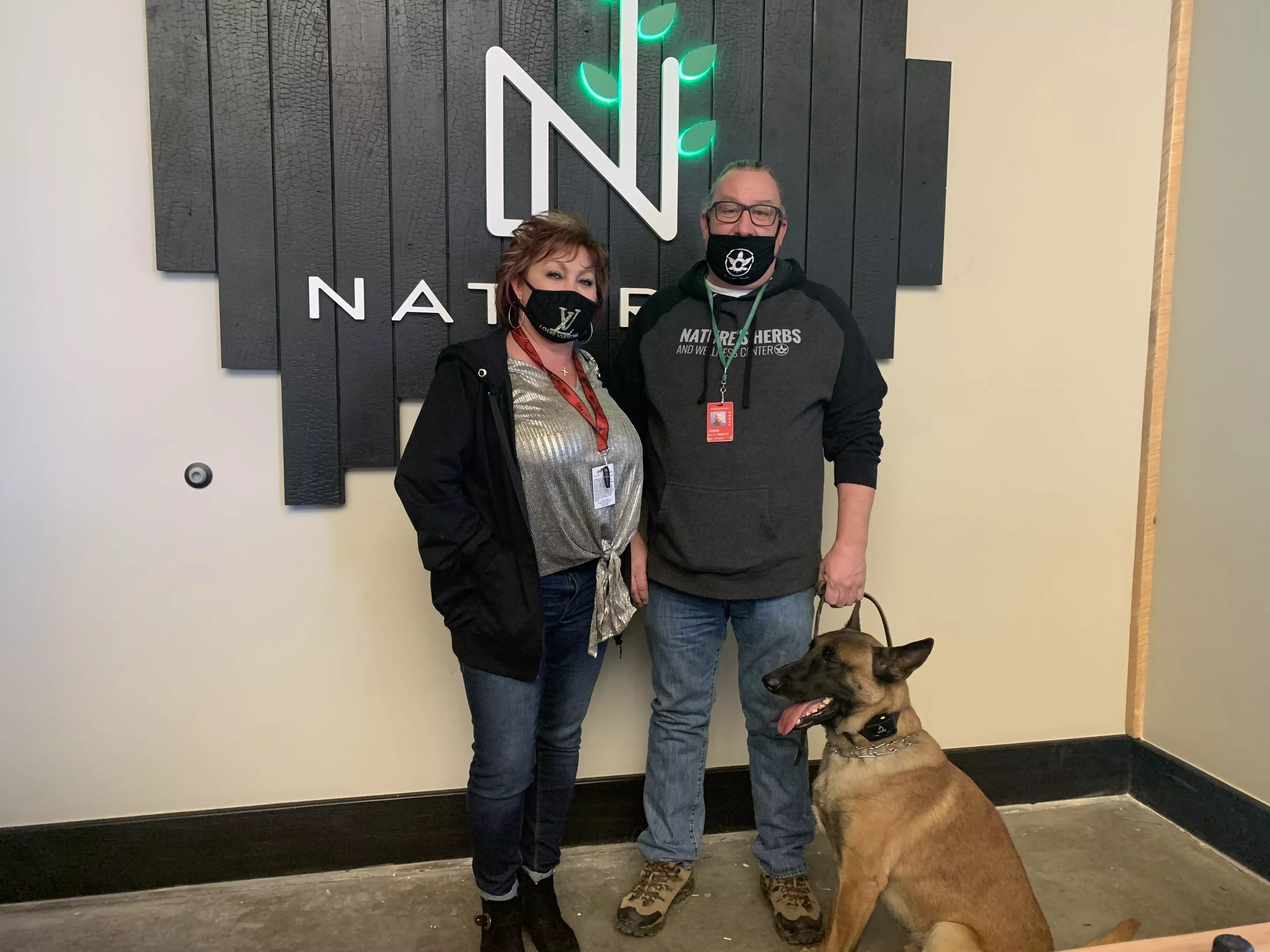 Long-time dispensary owners John and Alicia Rotherham pose with their dog, Mr. Gray.
