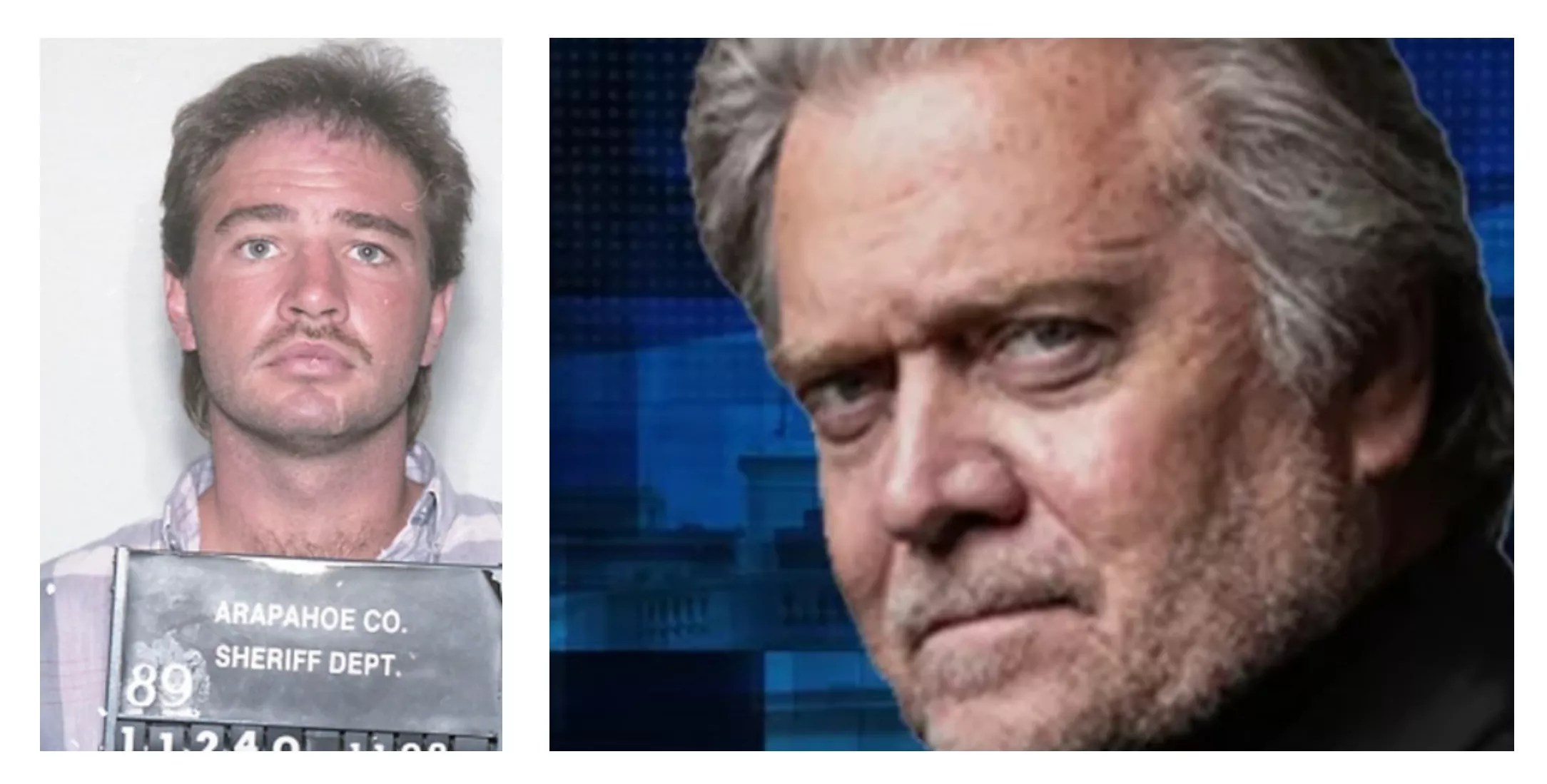 A vintage mug shot of Robert Sigg and a portrait of Steve Bannon on the Real America's Voice website.