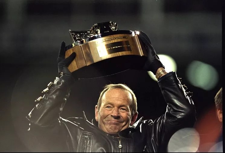 Pat Bowlen holds up the trophy after the Denver Broncos won the AFC Championship Game at Mile High Stadium in 1999.