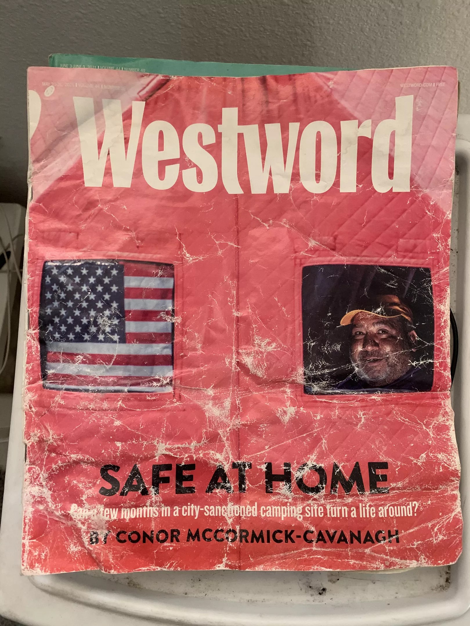 Montes was the focus of a Westword cover story in May 2021. The cover showed his happy face looking out from the plastic window of his tent at the safe-camping site. He got an issue as soon as it hit the stands; he displayed it in the window of his tent. The copy is weathered now because it spent so much time in that window, but Montes hangs on to it.