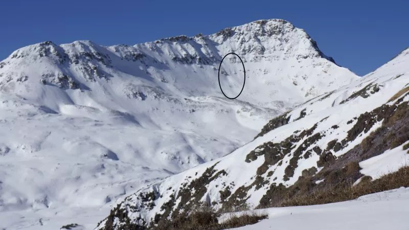 The oval in this photo shows where a soft-slab avalanche was observed on the west side of Red Mountain Pass along Commodore Ridge on October 20.