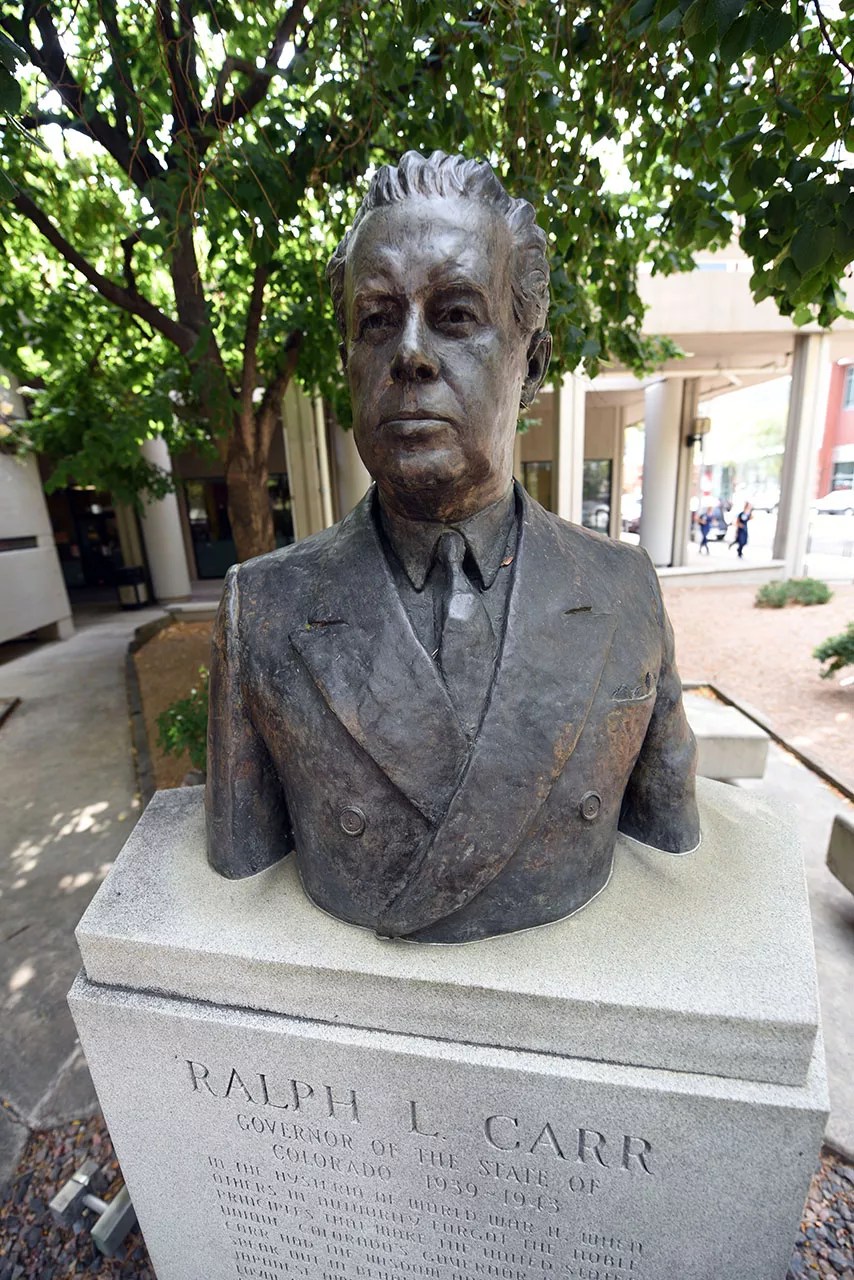 Governor Ralph Carr is honored with a statue in Sakura Square.