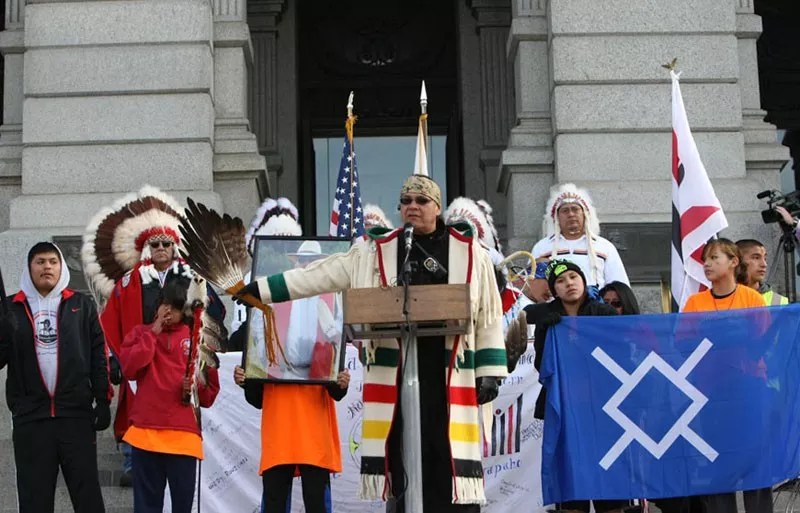 Otto Braided Hair at the Colorado Capitol on the 150th anniversary of the Sand Creek Massacre.