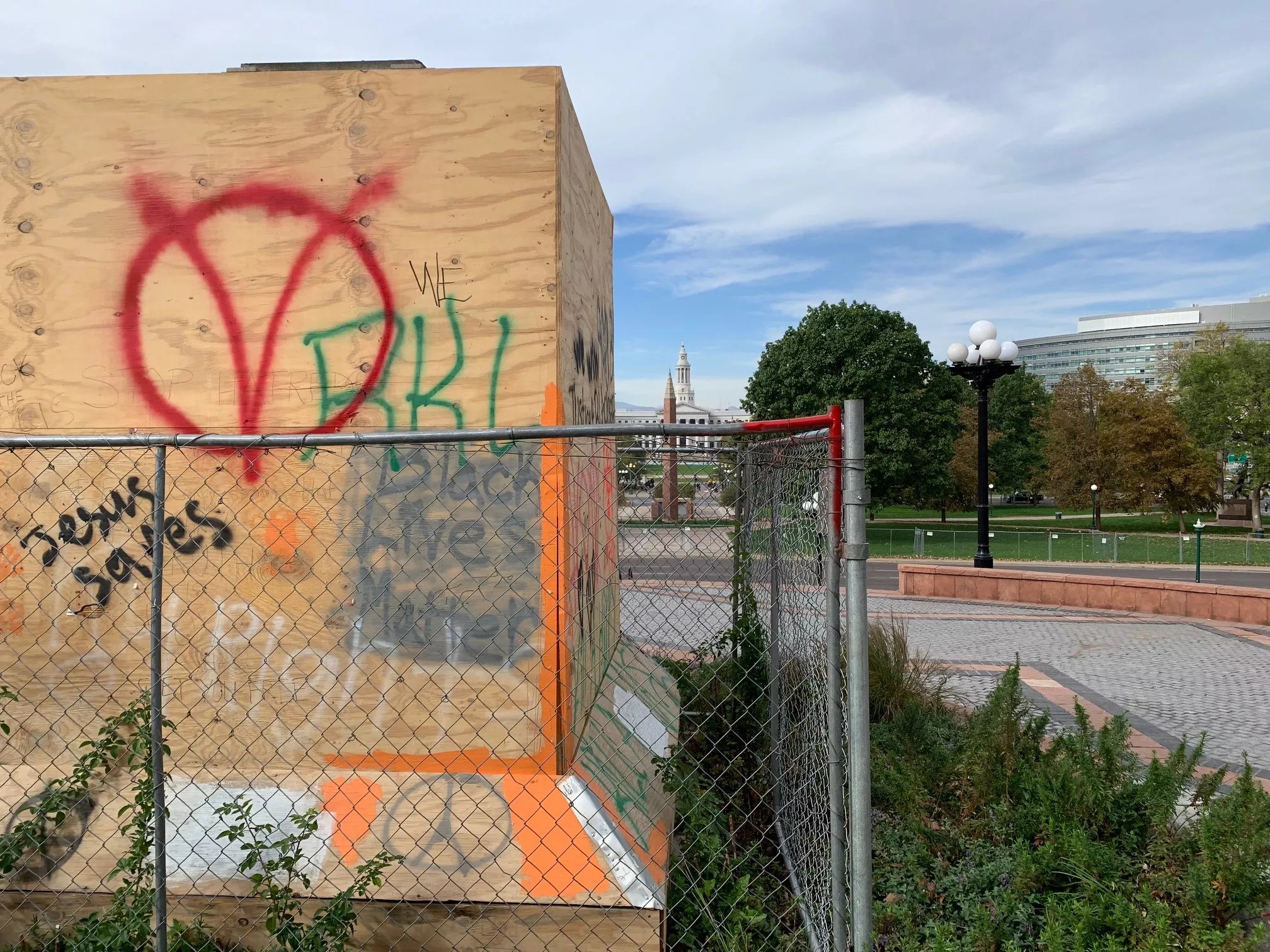After the Civil War Monument figure was toppled and its base set on fire a few days later, the Sand Creek plaque was taken away for safekeeping; the monument’s base is surrounded by plywood and a protective fence.