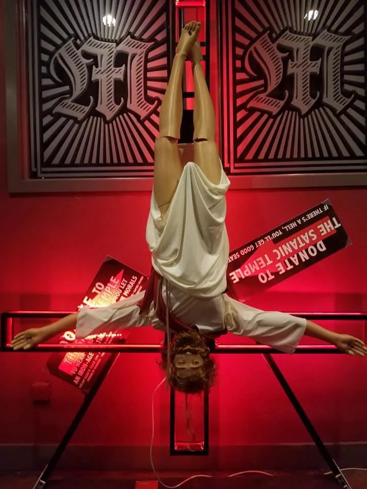 “Duality is a nine-foot-tall, steel-welded animatronic Jesus that’s mounted on an upside-down cross,” explains Harry Hoofcloppen, spokesperson for the Colorado chapter of the Satanic Temple and the person who designed and constructed Duality. Hoofcloppen and co-chapter heads Viktor LaMent and Persephone Gray comprise the three-pronged leadership of the Satanic Temple Colorado, known internally as the Triumvirate.