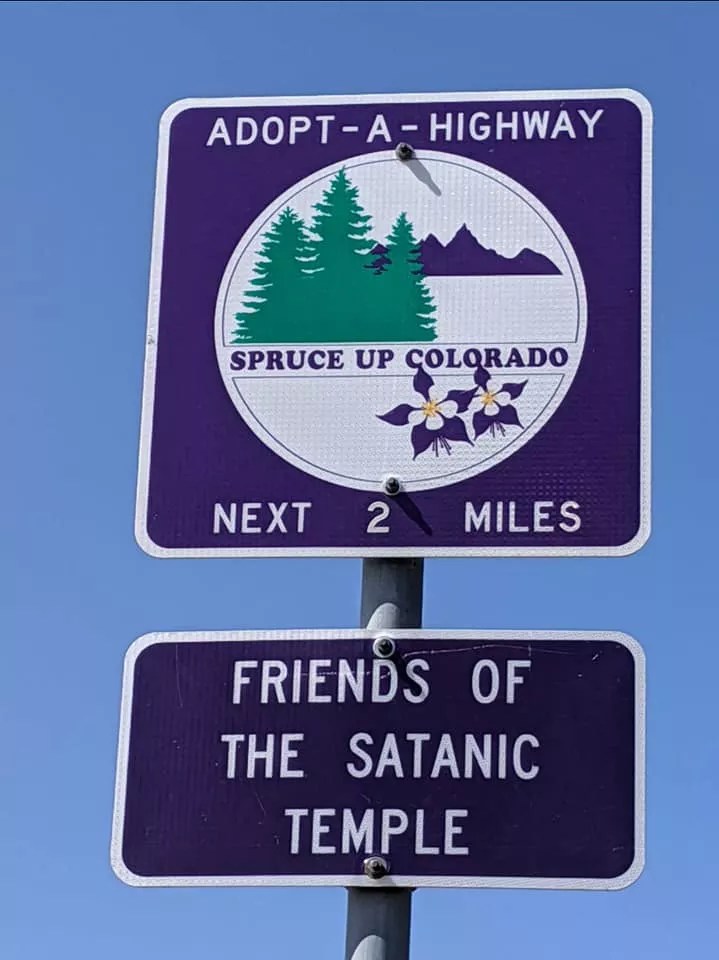Drive on Colorado Highway 128 in Broomfield at just the right time, and you’ll notice a group of people picking up trash from the side of the road by the grassy plains of the Rocky Flats National Wildlife Refuge. Pump your brakes, and you might also catch the wording of a purple road sign as you whiz by: “Adopt-a-Highway—Next Two Miles—Friends of the Satanic Temple.”