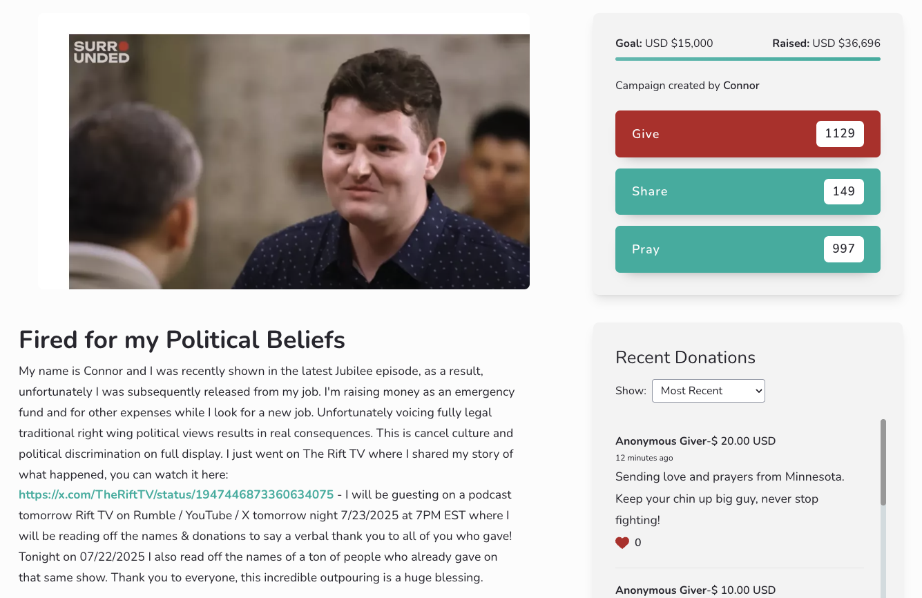 Estelle immediately turned to begging strangers for charity, launching a fundraiser to cover his living expenses while he looks for a new job. In his plea for handouts, Estelle described himself as a victim of “cancel culture” for his “traditional right wing political views.”