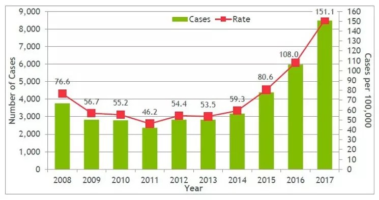 The rate of chlamydia in 2017 – 481.3 cases per 100,000 people – represented a 23 percent increase since 2013. The syphilis rate was more than two times higher: 14.6 cases per 100,000 people, a 61.5 percent leap over the same time span. And the 151.3 cases of gonorrhea per 100,000 people was up 182.3 percent in five years.
