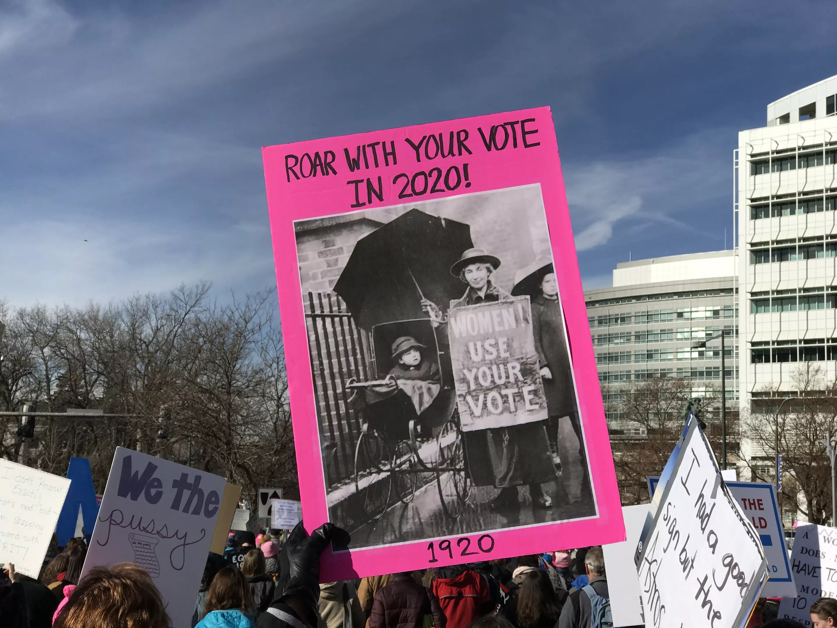Most of the messages come through the homemade signs that marchers pour their hearts into – and so we’ve profiled those signs in all their powerful glory in 2017, 2018 and 2019. Some years were nerdtastic (Carrie Fisher’s untimely passing right before the first march has made her – and Princess Leia, and Star Wars‘ Rebellion – a face for both feminism and opposition to political tyranny), and others were more solemn. In 2020, there was a decided mix of both the sarcastic and the serious, the pop culture and the political. So without further explanation, we happily offer the protesters – and their beautifully expressive signs – the spotlight.