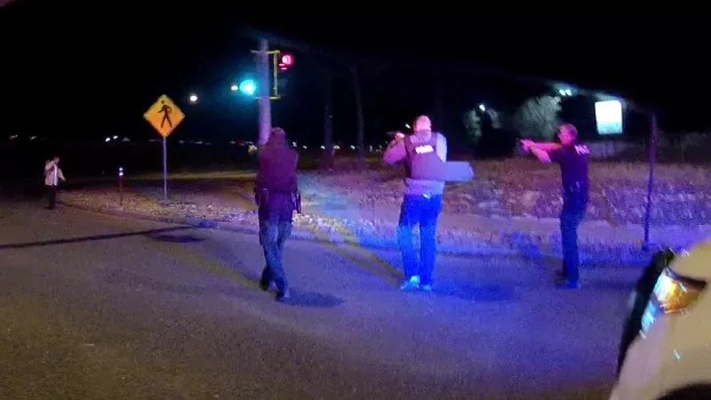 A screen capture showing three officers aiming their firearms at the late Nico Descheenie.