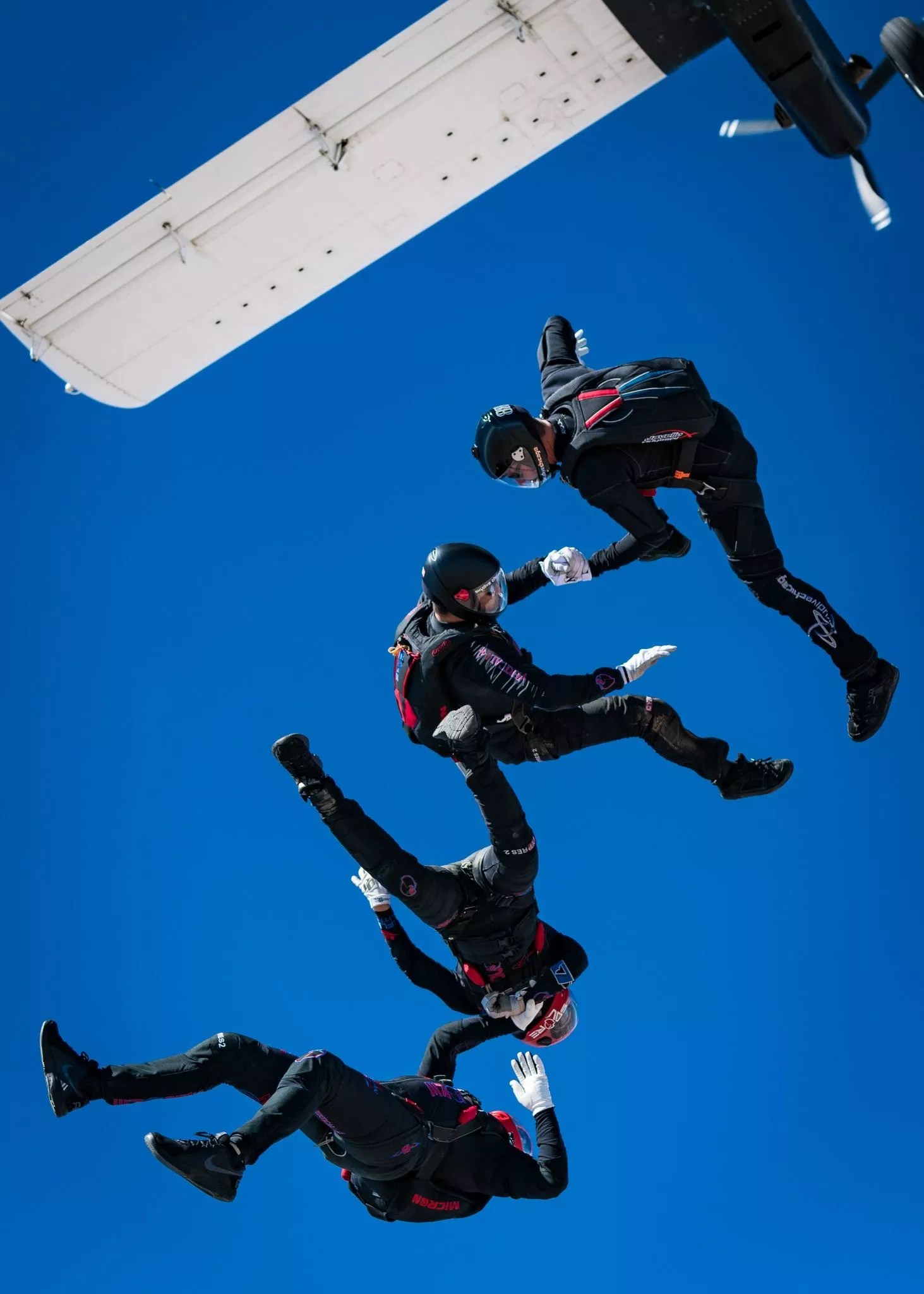 That’s when they joined their first vertical championship team, Skydive Dubai Nexus, which was sponsored by the Dubai International Parachuting Championships. Unlike the traditional, belly-down skydiving that most people imagine when they think of jumping from a plane, in vertical skydiving participants aim their feet at the ground and synchronize their bodies to earn points during competition.