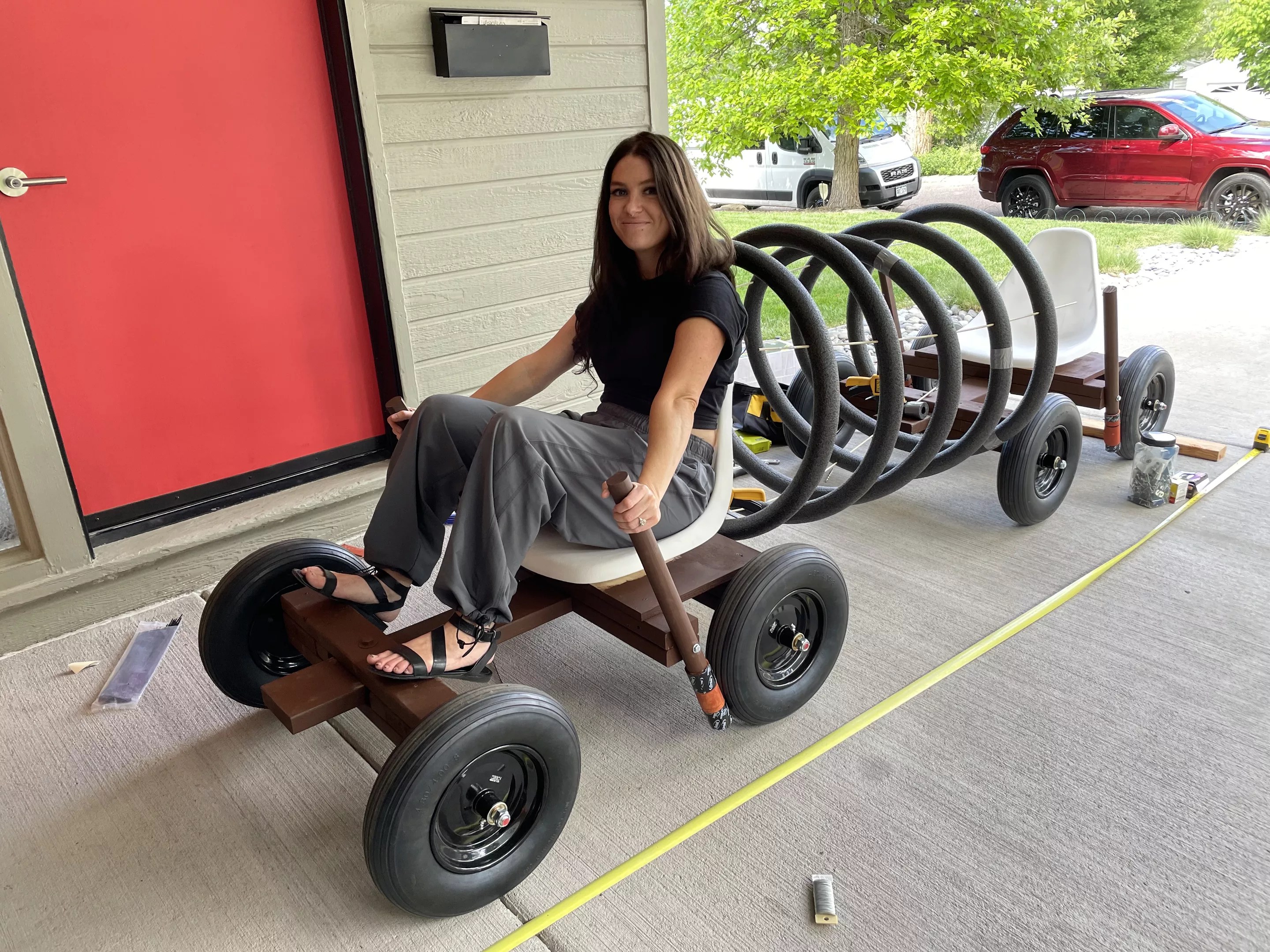 The Racliffs and Hedrick started with the concept of a weiner-dog cart because they thought it would be funny. Cody also liked the idea of two separate carts connected to each other, so the slinky dog, reminiscent of the character in Toy Story, emerged as the idea they submitted to Red Bull.