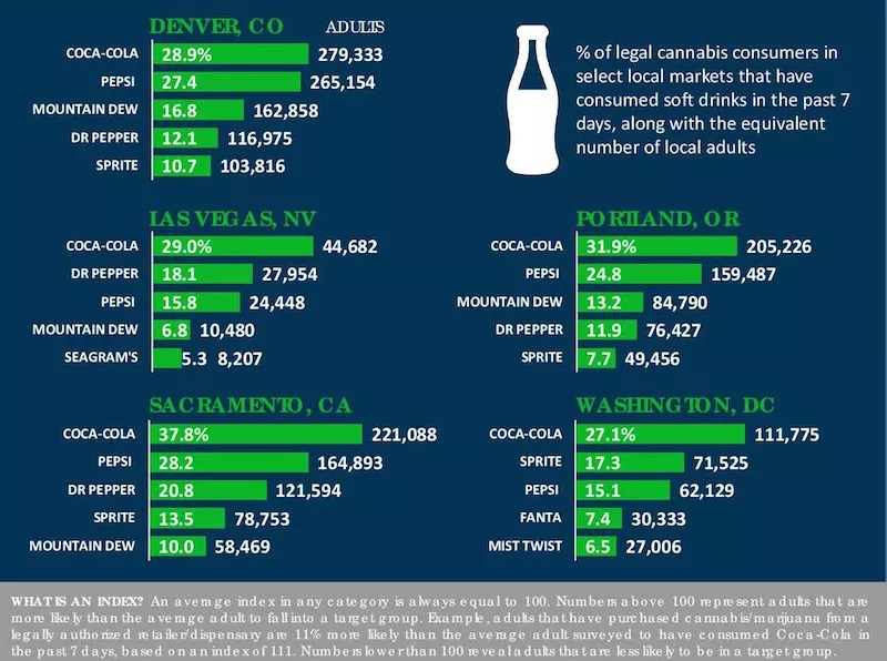 As part of their Cannabis Freakonomics study, Green Market Report and Consumer Research Around Cannabis have been studying how legal cannabis affects consumerism, studying motivations for cannabis consumers both before and after they get high. The first munchie-related study determined which Denver-area fast-food chains were visited the most by adults who had recently been to a dispensary and found the usual heavyweights at the top. The newest study looks at soft drinks, and there aren’t many surprises here, either.