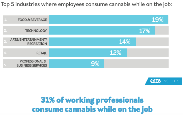 Of consumers who use marijuana on the job, food and beverage and technology workers topped the list.