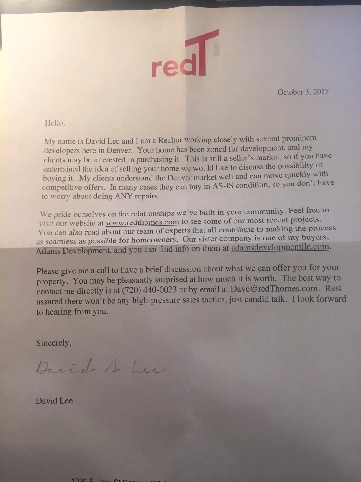 “My name is David Lee and I am a Realtor working closely with several prominent developers here in Denver,” starts the letter (see it at the bottom of this post). “Your home has been zoned for development, and my clients may be interested in purchasing it.”