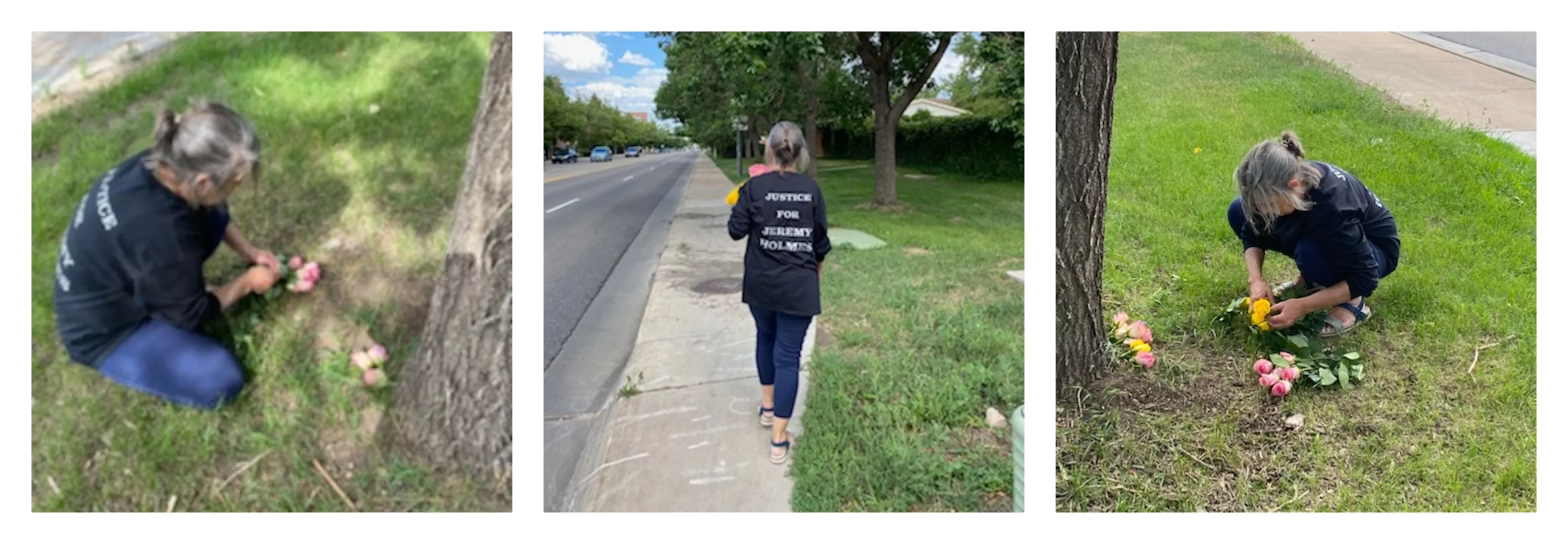 While in Colorado, Holmes visited the spot where Jeremy had died — a location she knew very well. “His blood was there for months,” she says, “and I kept seeing it, because I went there every single day. I took roses every day for months, since it was the only thing I could do to deal with the pain. I also put a statue of Buddha there and planted a bush, and a lot of people who actually heard the shooting came to memorialize Jeremy with little electric candles they put by the tree where he bled out. The coroner’s report said he lost almost all of his blood at that site.”