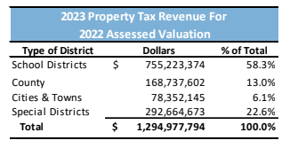 School districts and special districts, meanwhile, rake in $755,223,374, or 58.3 percent, and $292,664,673, or 22.6 percent, respectively.