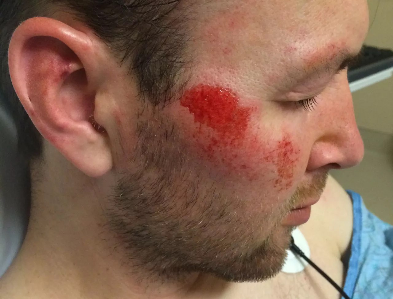 Then come the still frames. His car is pulled to the side of the road, somewhere in the boondocks, and there’s a police officer approaching him, yelling at him. Leadholm smiles at him. The next thing he knows he’s handcuffed by the side of the road. His hands are numb, his face bloody and on fire from pepper spray.