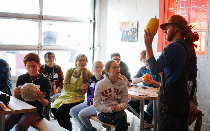 A chef talks with kids as part of a cooking workshop that saw them canning vegetables and creating homemade pizza.