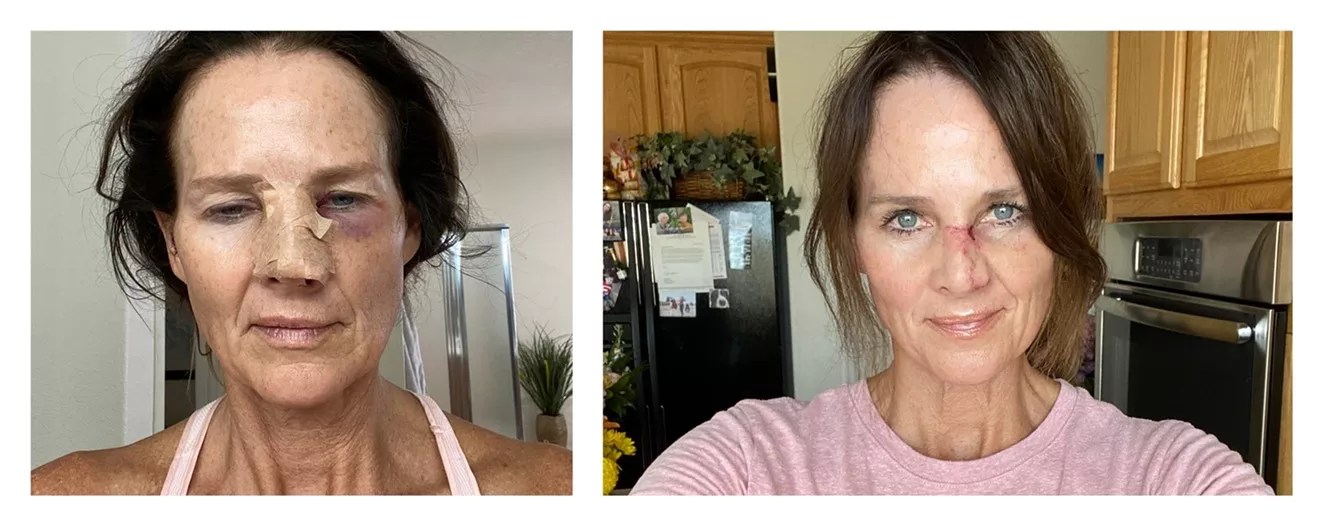 Kathy Sabine following her July 8 surgery and in a selfie taken on July 18.