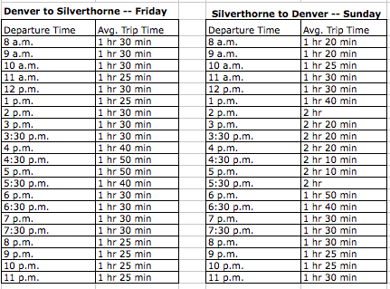 Using this function of Google Maps, we examined the drive times between Denver and Silverthorne (on the west side of the Eisenhower Tunnel), which is the 65-mile stretch of I-70 that seems to get the most congested on weekends.