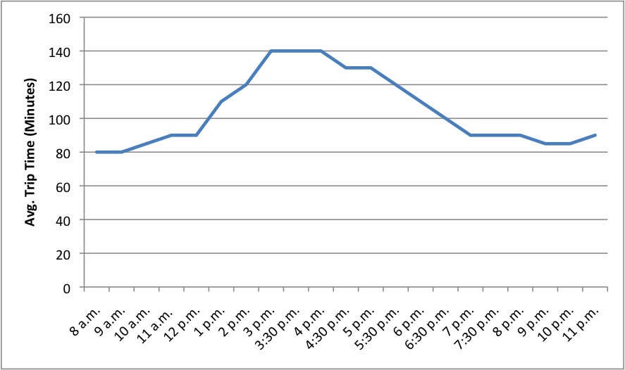 As the charts show, the time of departure from Denver on a Saturday morning has a profound impact on drive time; the difference between leaving at 5:30 and leaving at 6:30 a.m. is nearly 55 minutes of driving. The worst time to leave Denver is between 7 and 7:30 a.m., when the commute to Silverthorne takes nearly two and a half hours as opposed to 1 hour and 25 minutes without traffic.