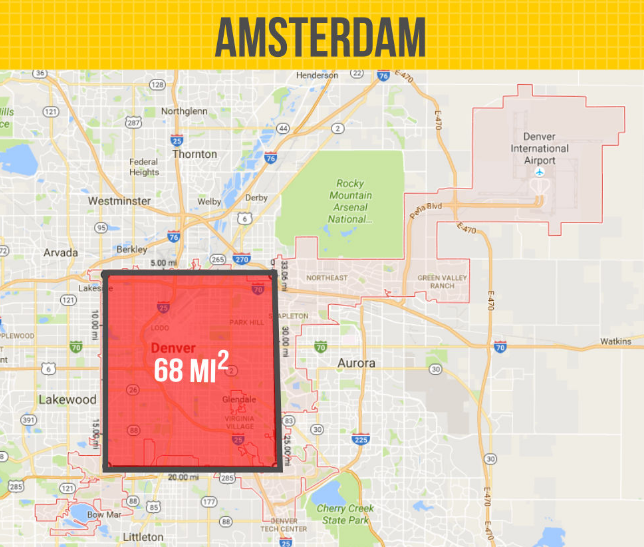 7. Amsterdam If Denver were as dense as Chicago, it would cover 57 square miles, or 37 percent of its size. sparefoot.com