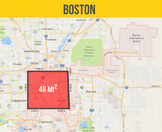 5. Boston If Denver were as dense as San Francisco, it would take up 37 square miles, or 24 percent of its current size. sparefoot.com