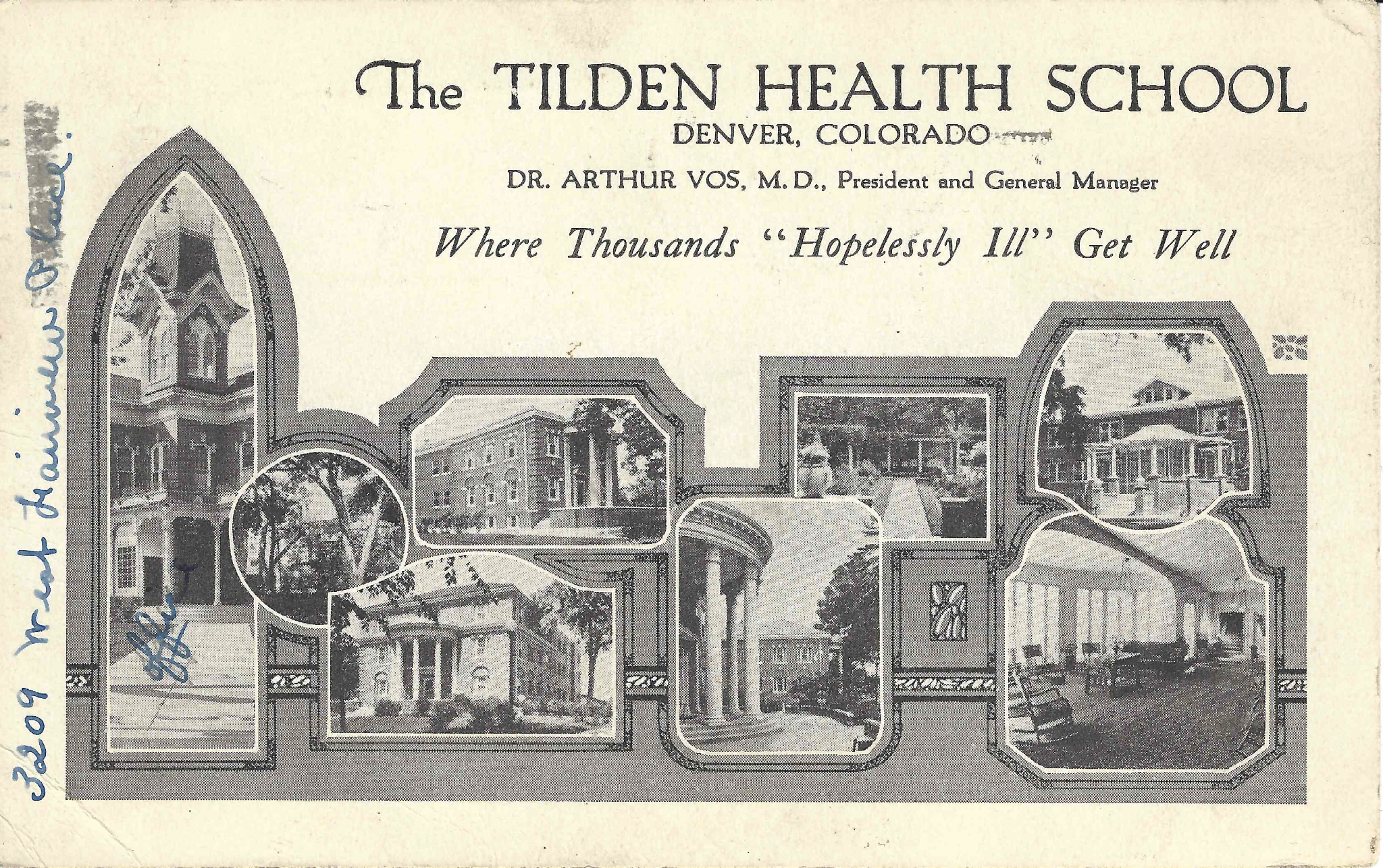 Looking at what the Bosler House’s transformation had meant to the area, members of the West Highland Neighborhood Association decided to see if the city could be persuaded to expand that landmark designation to celebrate a particular time in the building’s past. In 1914, Dr. John Henry Tilden had bought the property with plans to convert the house into the headquarters of a health school he proposed creating, then add other buildings on the extensive property. The Tilden Health School, which opened in 1916, not only taught health, but it housed patients from around the world, drawn to Denver for the climate and clean air. A 1927 ad for the facility noted that it was “where thousands [of] ‘hopelessly ill’ get well without drugs, serums or surgery.”