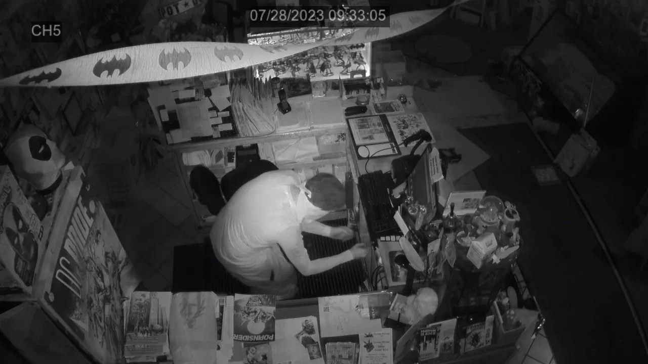 It wasn’t just a snatch-and-grab: The burglar took the time to gather up assorted comic-related valuables before heading to where the store kept its cash deposits and petty cash overnight; he stole that money, too, amounting to almost $300.