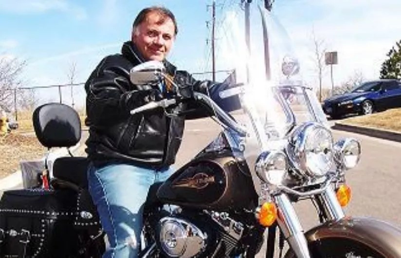 A vintage shot of Tom Tancredo astride his motorcycle.