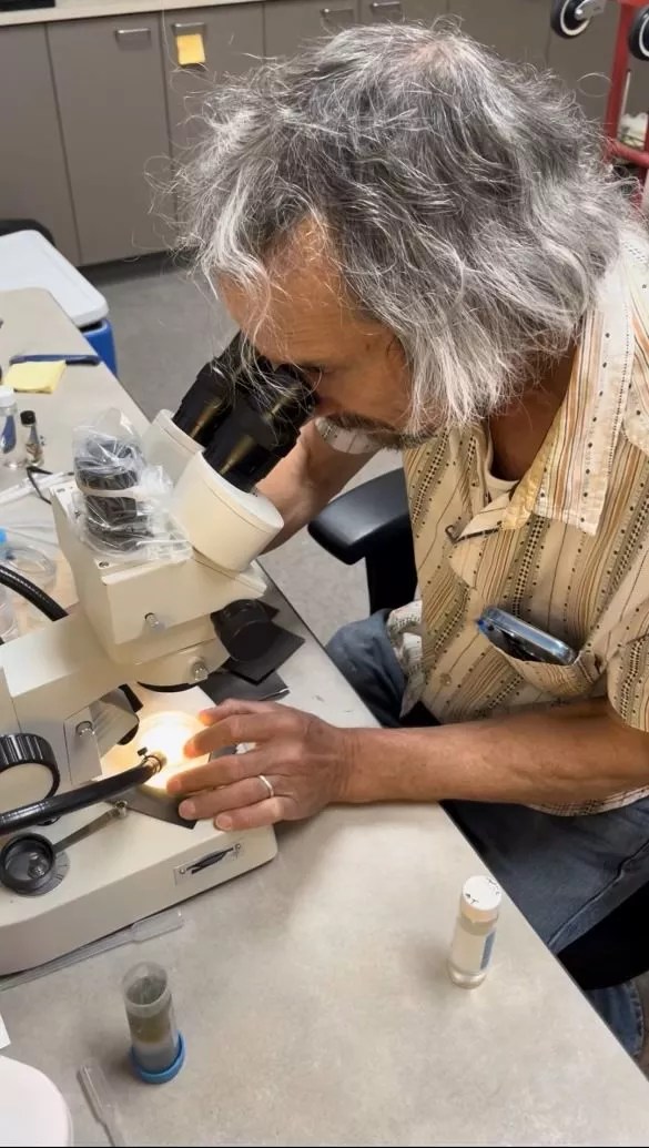 Al Polonsky examining an algae sample to determine if there are toxins.