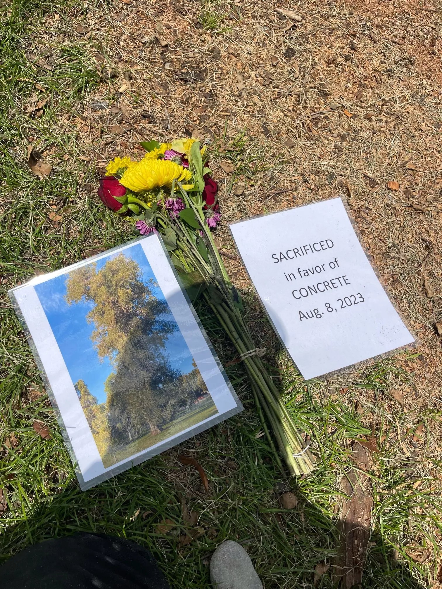The makeshift memorial that popped up recently includes a bouquet of flowers and a photo of one of the slain trees.