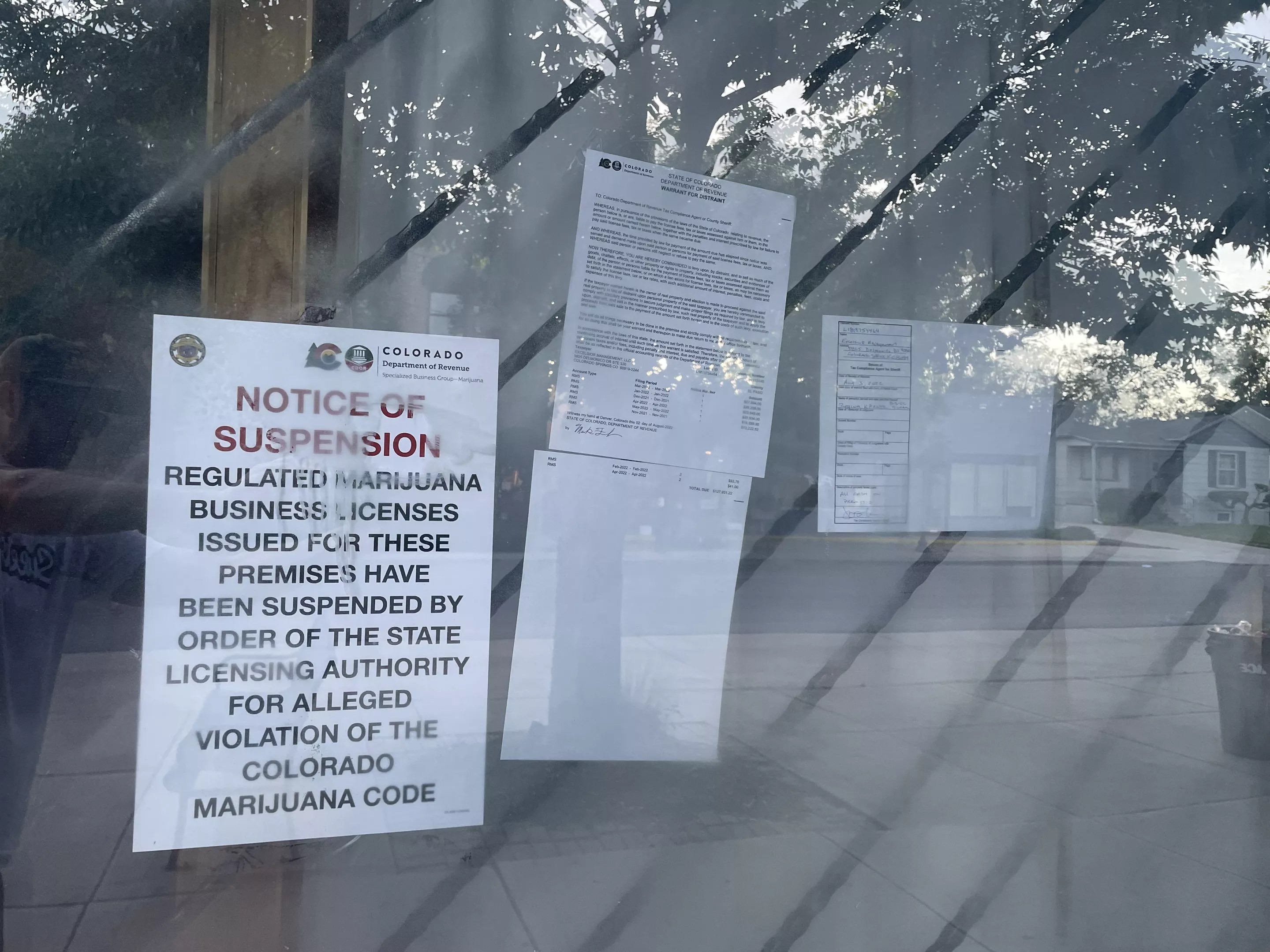 A closure notice from the Colorado Marijuana Enforcement Division posted on a TweedLeaf store at 2383 South Downing Street.