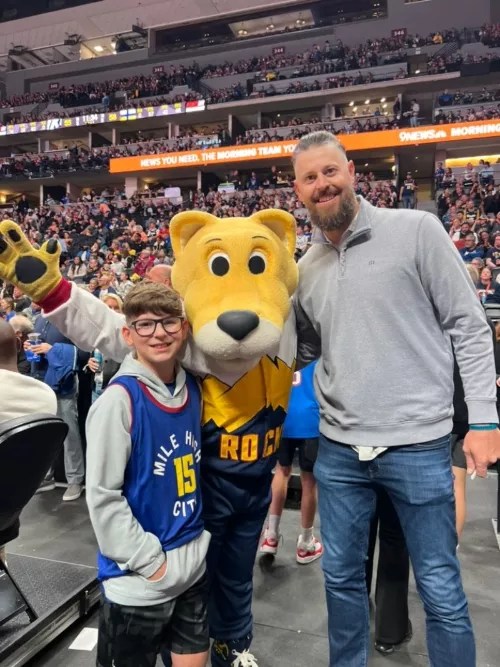 Tyler Polumbus and his son strike a pose alongside Nuggets super-mascot Rocky on October 22.