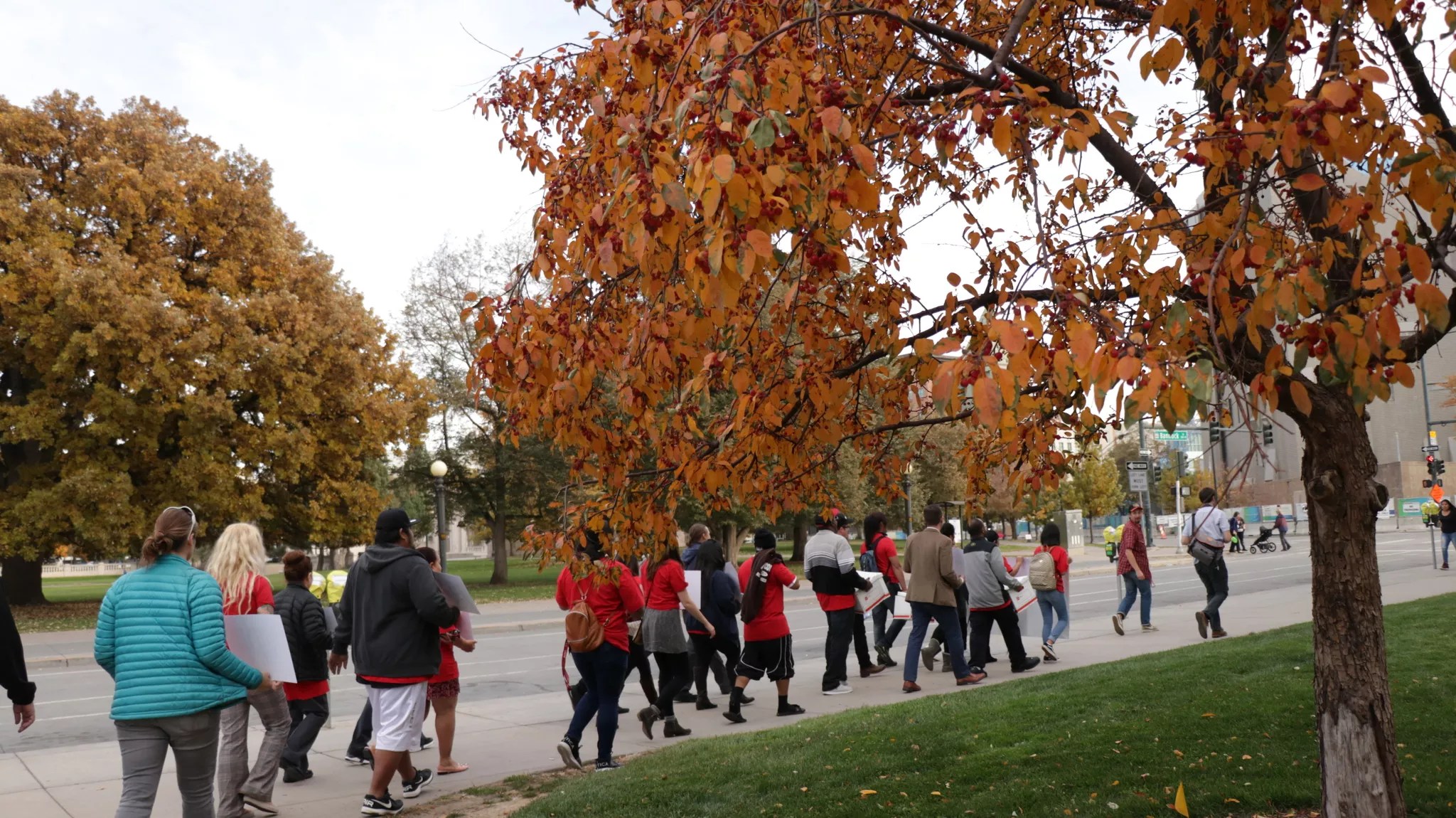A procession walks to the Denver Elections Division to turn in signatures on Tuesday.
