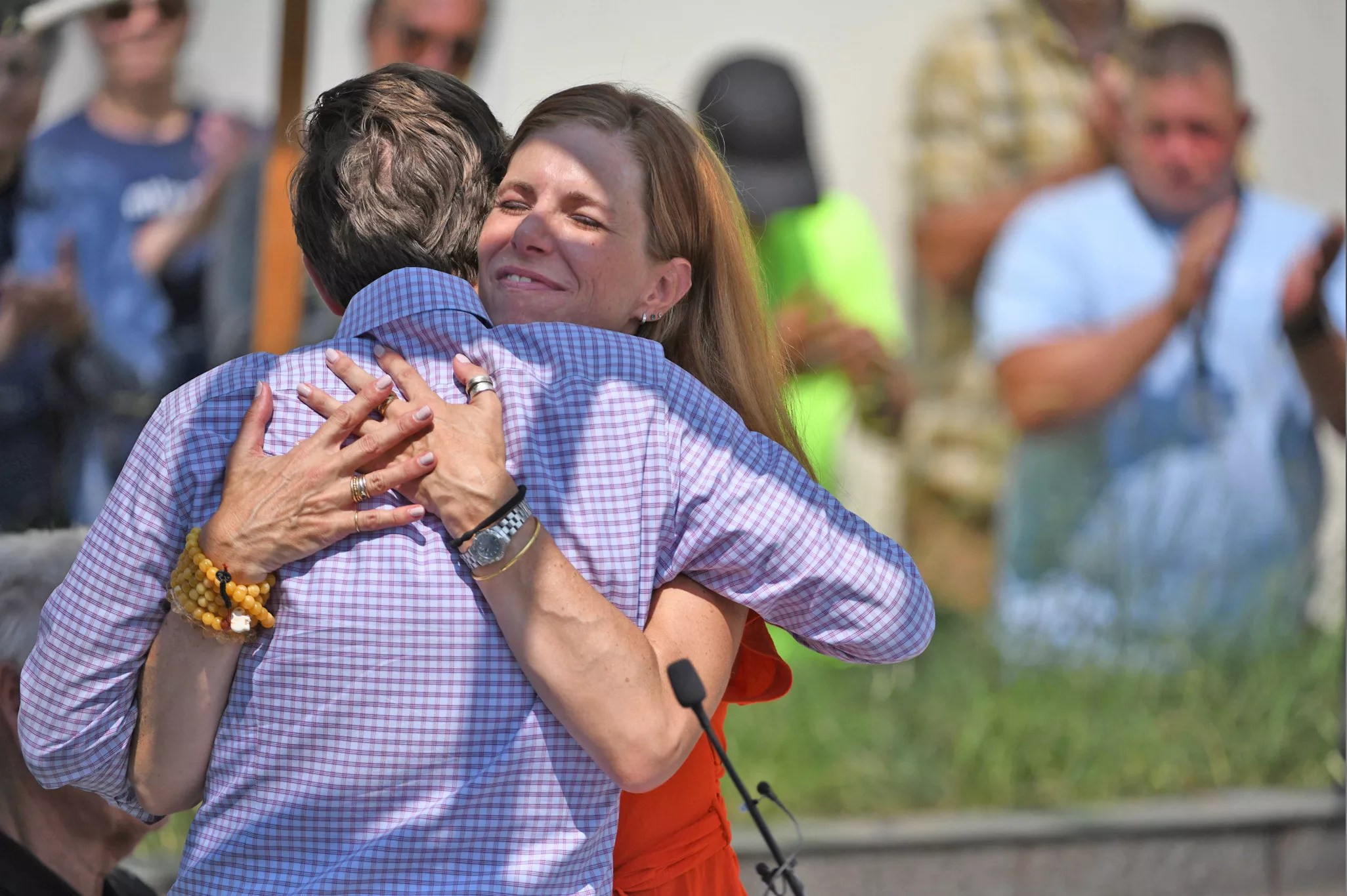 Denver Mayor Mike Johnston and Urban Peak CEO Christina Carlson hug during the grand opening of Urban Peak’s new Mothership Center at 1630 South Acoma Street on Wednesday, July 24.