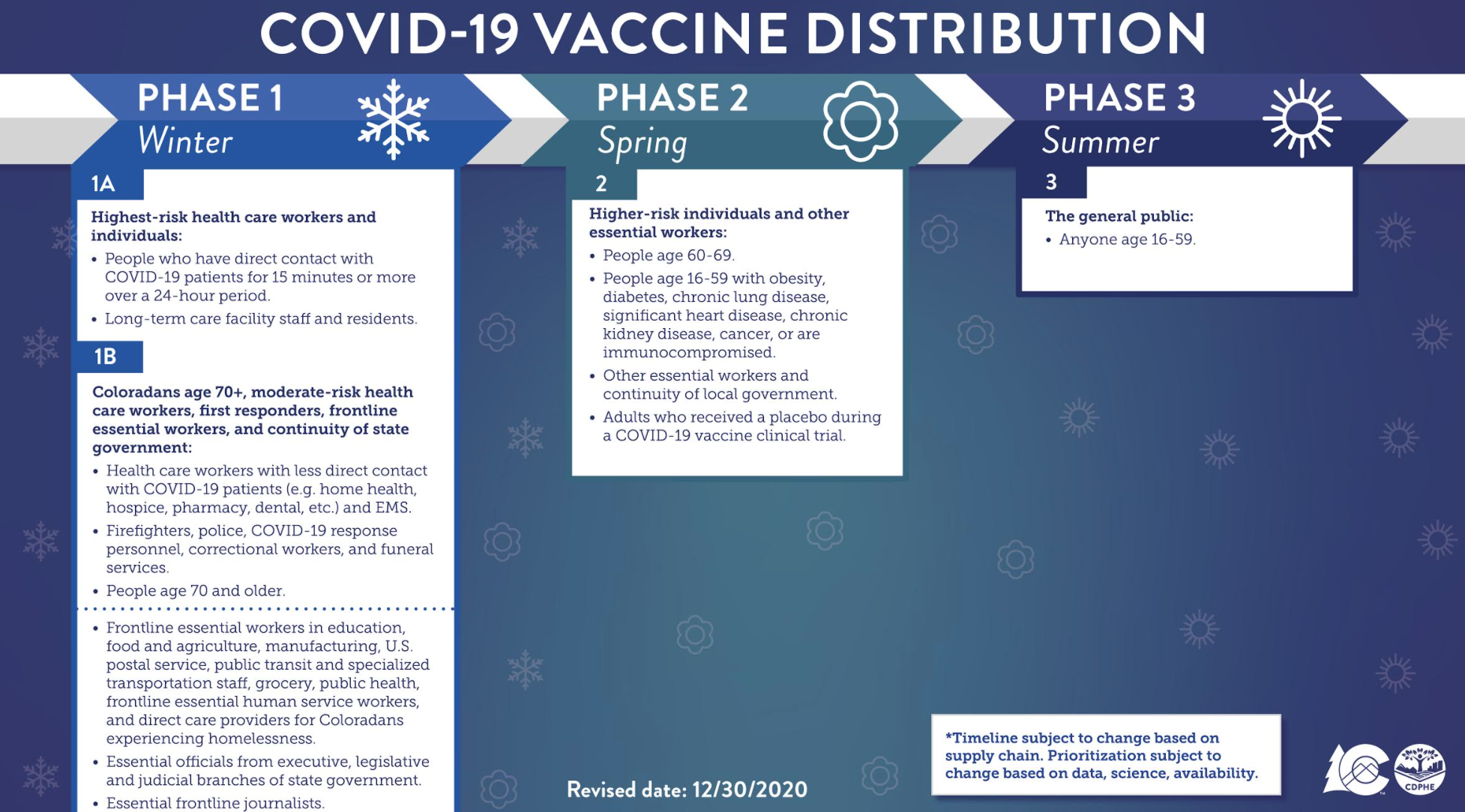 Polis said the state is estimating that phase 1B will be concluded in four to five weeks. After that, Colorado will move into Phase 2, including those with pre-existing conditions and Coloradans age 60 to 69. The timeline is “all dependent on the steady supply of vaccines,” he added.
