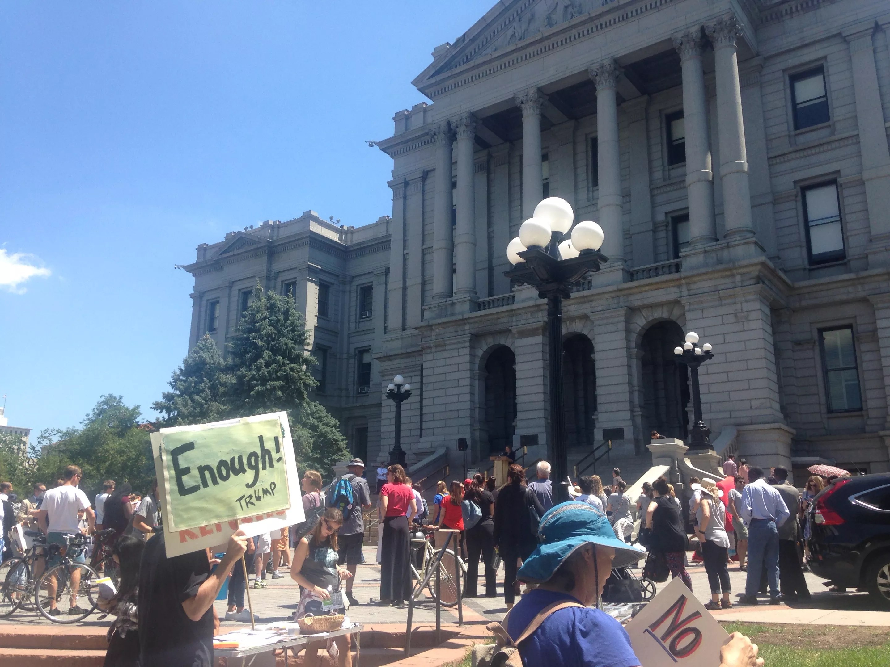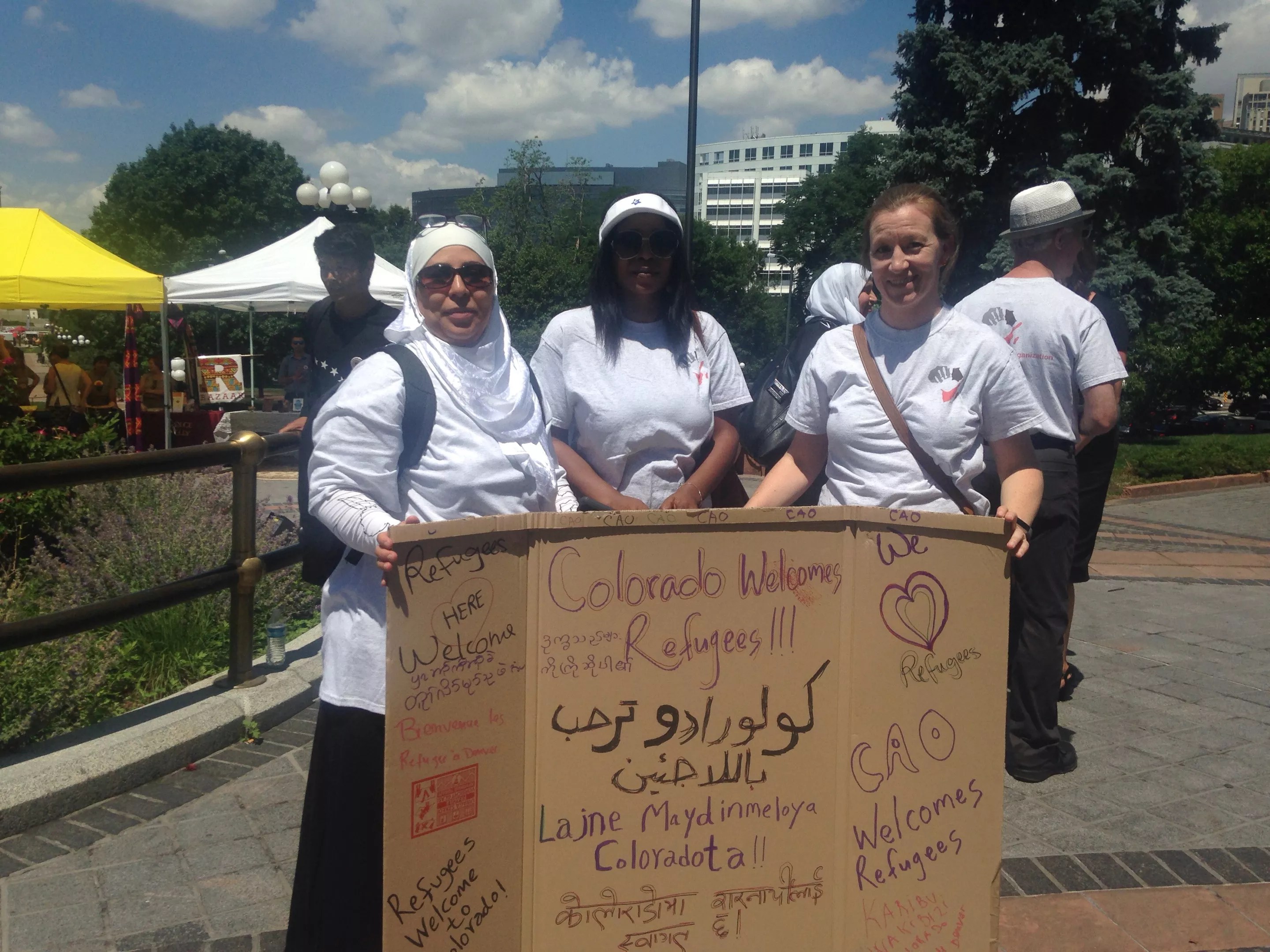 Three women held up a sign supporting refugees in Colorado at a celebration of World Refugee Day at the Colorado State Capitol.
