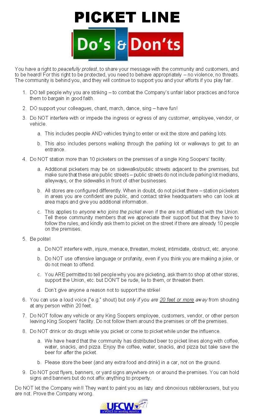 On January 19, a week after the strike against metro Denver stores began, Local 7 shared a list of “Do’s & Don’ts” related to the order. The last item on the roster: “Do NOT let the company win!! They want to paint you as lazy and obnoxious rabblerousers, but you are not. Prove the Company wrong.”