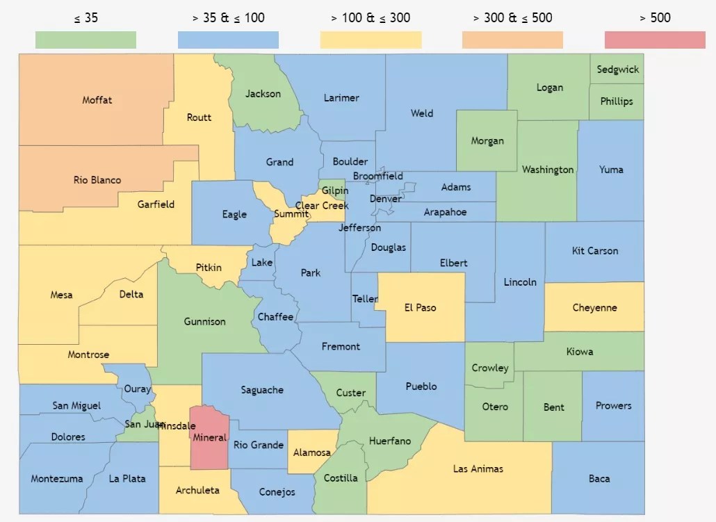 The seventeen Colorado counties that meet the CDC’s description of high transmission include fourteen at Level Yellow, two at Level Orange and one, Mineral County, at Level Red.