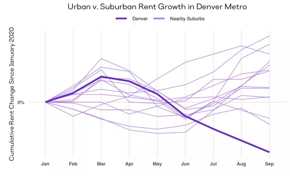 A new study suggests that a growing number of renters are moving from Denver to surrounding suburbs, even though prices in the Mile High City have actually been falling during the COVID-19 pandemic.