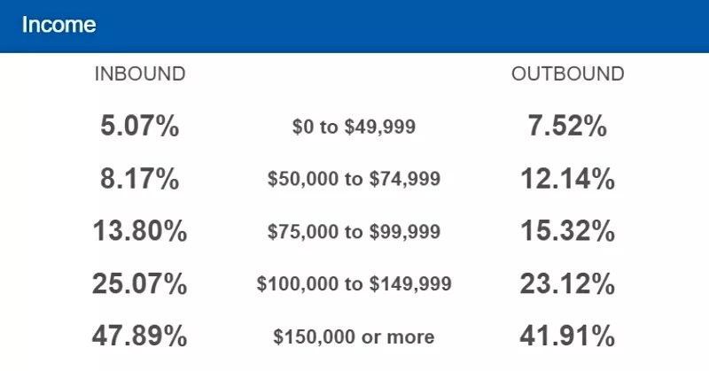 United Van Lines stats from 2021, the most recent year for which information is available, showed that nearly half of those who moved to Colorado that year — 47.89 percent — had incomes of $150,000 or more. Meanwhile, more people with incomes between $0 and $49,999, as well as $50,000 to $74,999, left Colorado than came here.