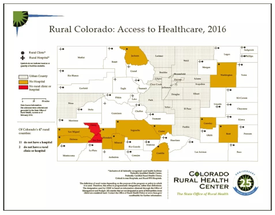 Here’s a graphic from the report showing health-care facilities in Colorado by county. The locations in yellow don’t have a single hospital, and the two in red have neither a hospital nor a rural clinic.