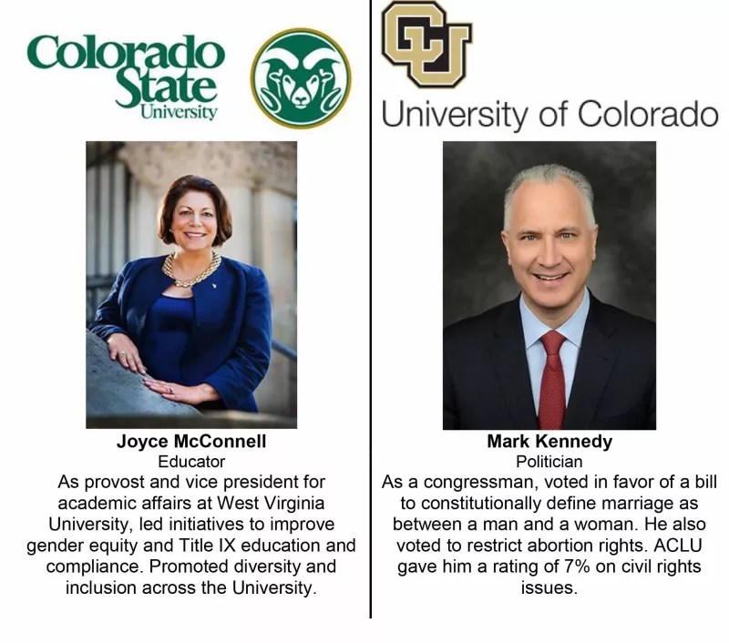 This meme contrasts newly hired Colorado State University president Joyce McConnell and Mark Kennedy.