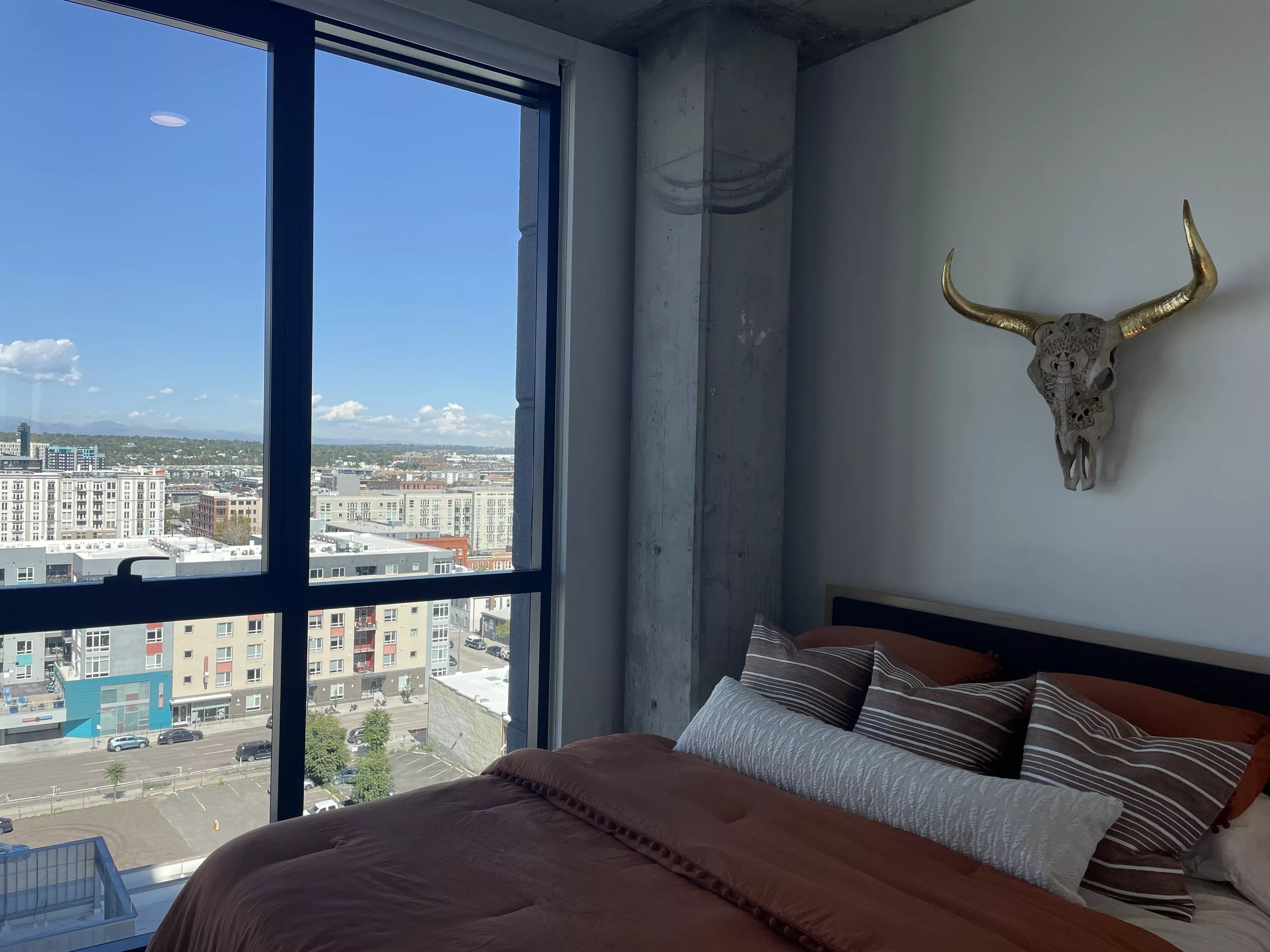 At X Denver 2, some units feature exposed concrete beams, which are another upgrade. “Each bedroom will have its own pros and cons,” Morris says. “For example, this is my favorite because of the windows and the view, right? It would carry a heavier premium than one that didn’t look at the mountains or the city or maybe had smaller windows, but that bedroom might have a larger closet or a little bit more floor space in the room itself.”